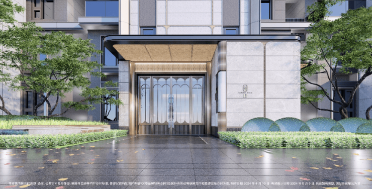 酒店式门廊作为归家的第一道风景,招商臻境以空间大尺度与高级奢石的材质使用将尊崇的归家礼遇感拉满。近50米宽,高度约5.3米高,开口约11米长的高规格酒店式大门。选用了贝金米黄石材作为墙面主材,墙裙用印度蓝石材做装饰。两侧甄选了两颗名贵的罗汉松,有着恭迎归家的美好寓意。