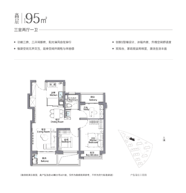 建面约95㎡高层,全系方正户型,双阳台设计,LDKB一体化设计,贯通动区轴线,打造温馨的家庭生活聚餐;