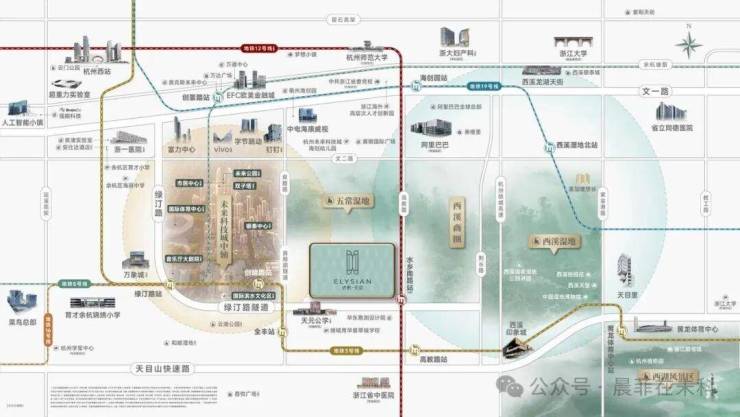 一核双轨:12号线水乡南站(在建,预计2026年底投入使用)(直距约40米);3号线全丰路站(直距约1KM),12站到黄龙体育中心;地铁五站达杭州西站,以西站为核心构成了杭州长三角一小时交通圈的雄心