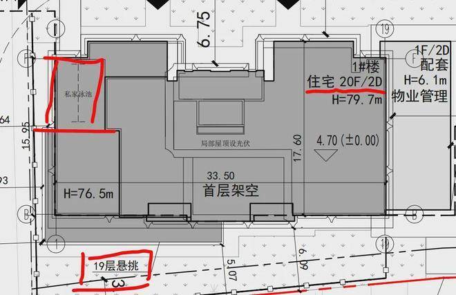 该方案亮点颇多,总计八幢高层和小高层设计,最南端的1#和2#楼均设置有私家泳池,而且还在19F采用了住宅楼当中较为少见的悬挑工艺,延伸出了一定的使用空间,个人预估这两幢会是配置大平层豪宅产品。