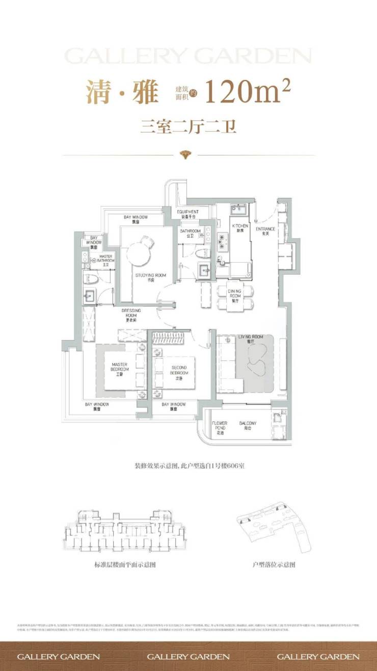 建面约120㎡的户型,定制LDKB一体化宽厅,更舒适的功能定制,270°转角窗观景套房设计,实现了居住品质与观景的完美结合。