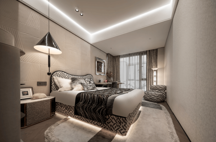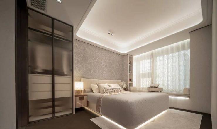 即便放了双人床、两个床头柜、一个收纳柜、两个休闲座椅和茶几,空间依旧绰绰有余,尺度感惊人!