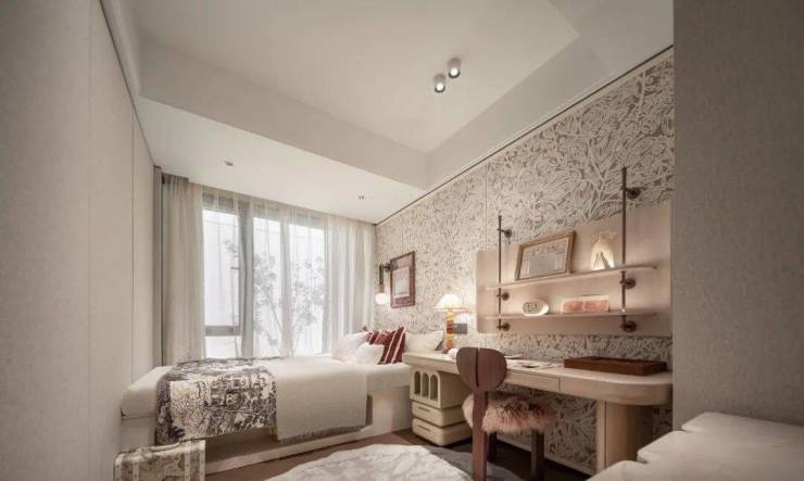 而这个北次卧不仅能放下一张完整的床,还能放下一张大尺寸的学习操作台或梳妆台,甚至还有空间做一些收纳柜和床头柜等。尺度感和实用性拉满!