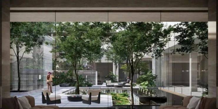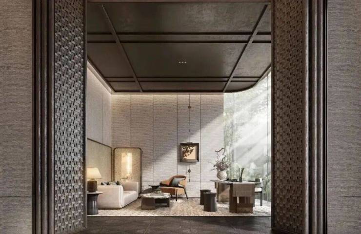 双轴线的设计,充分拓宽了视野面与观赏点位,环形回廊、精神游廊与下沉庭院通过立体景观平台相融,又创造出隔岸听泉的诗意场景。在每个重要生活触点,业主都能拥享独特景观和欣赏视野。