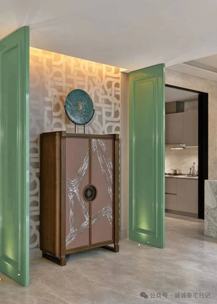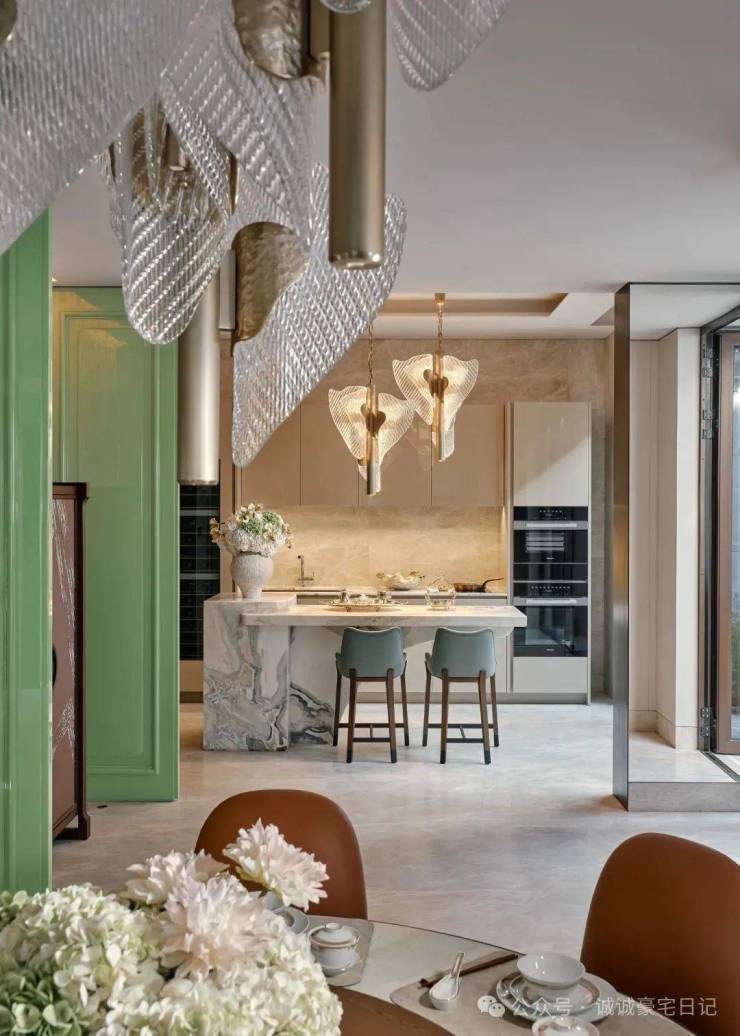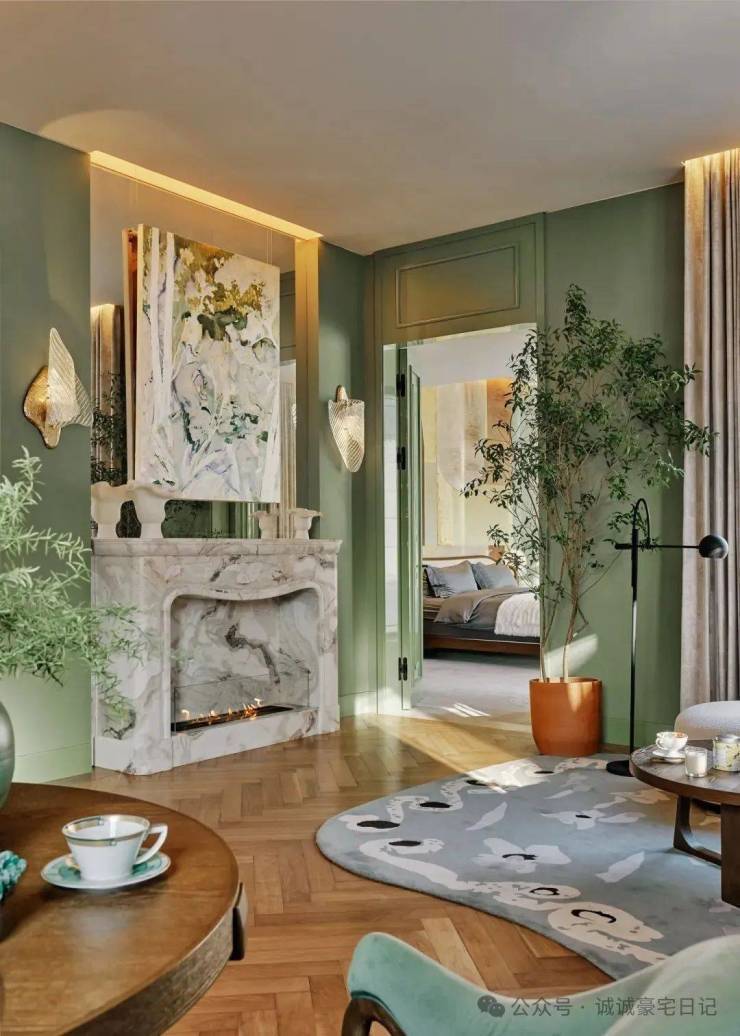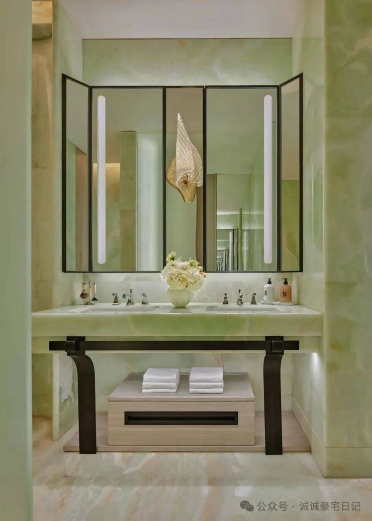 顶层下午茶区以淡绿为底,壁炉暖光漫过手绘地毯的肌理,将社交场域沉淀为冥想容器;主人房墙面缟玛瑙(Onyx)的天然流痕,也与一层屏风暗纹形成时空对位,光影在矿物晶体中生长出私密的诗。