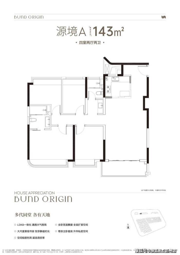 A户型是4房2厅2卫格局,三开间朝南+LDKB一体化+全卧室带飘窗+主卧套房设计+动静分离,居住功能性更强.