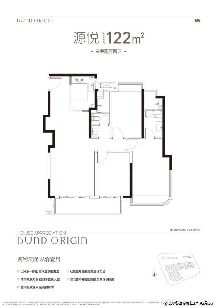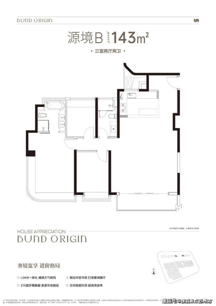 B户型是3房2厅2卫格局,三开间朝南+LDKB一体化+奢阔宽厅+全卧室带飘窗+主卧套房设计+动静分离+主卧270度飘窗,舒适度更高.外滩源著复兴里售楼处电话:400-8118-224