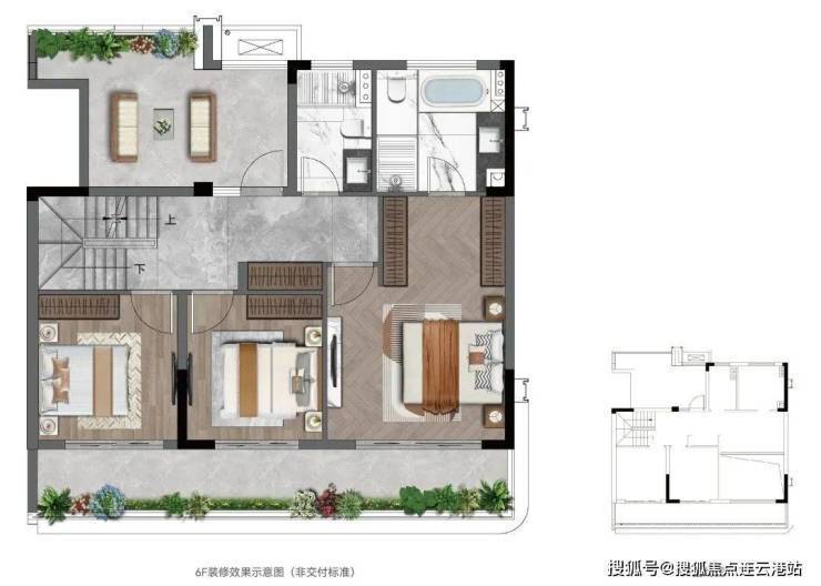 三楼也是双套房,朝北带露台,并且顶楼还送一个大露台(无需二次改造)。