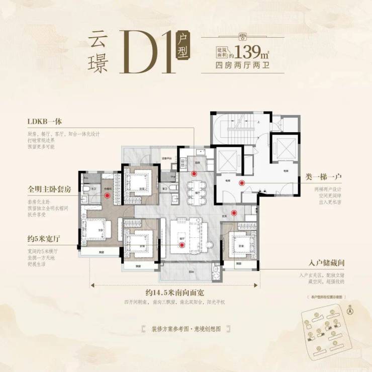 1、四大开间 面面朝南(南向面宽约14.5米)