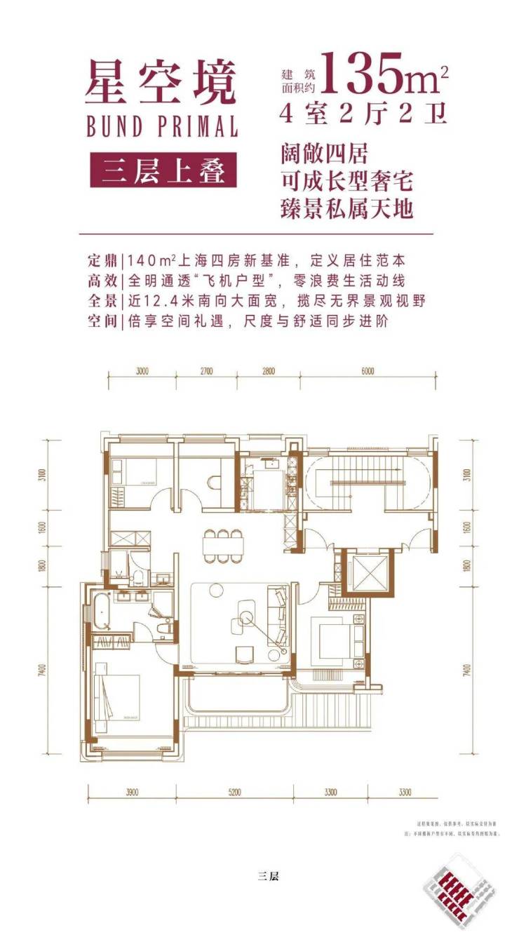 建面约134㎡4房2厅2卫(三层上叠):