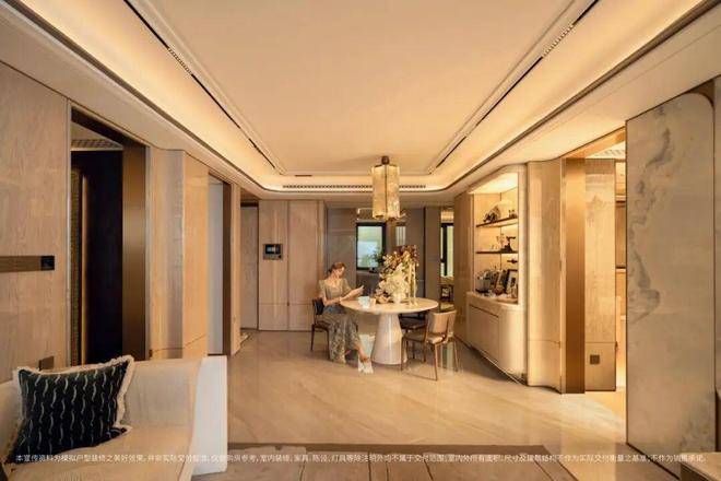 在材质与细节上,115㎡户型从入户开始就拉满顶豪质感,木饰面可随心切换高光白栓木/ 雅光球莎木双款木饰面,搭配铂金冰玉等三款岩板背景墙,让小户型也有不妥协的专属格调。