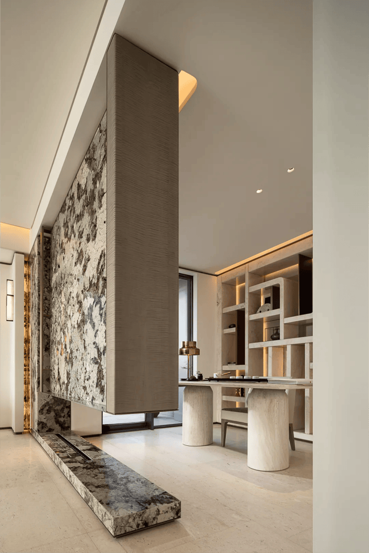 蓝灰色玻璃+仿石铝板+艺术涂料材质,穿插优雅线条,让建筑这张“脸”看起来更高级。One&Only酒店式门头。用雕塑体块、温润弧面和雅致线条,营造具有艺术格调的归家仪式感。