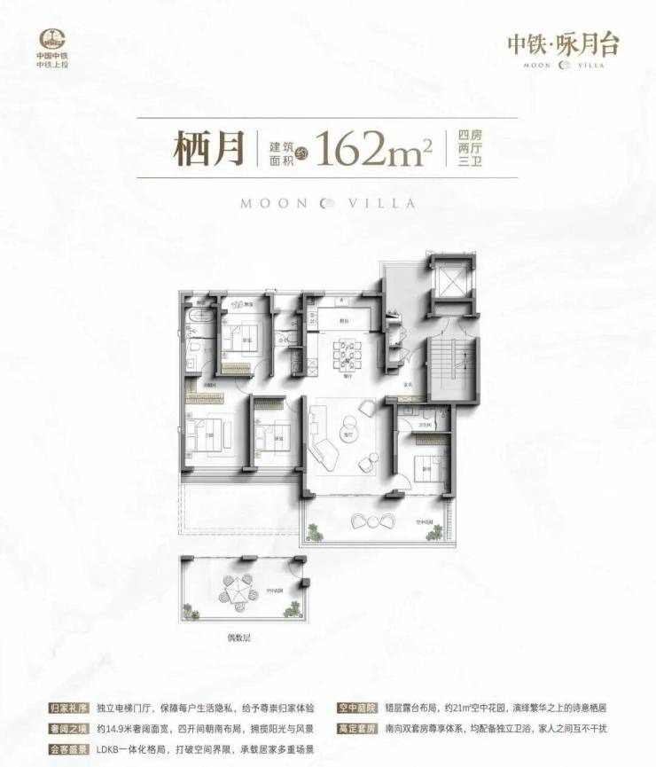 中铁·咏月台创新规划建面约162/164㎡四代洋房,以奇偶层错位的巧妙布局,为每户规划景观露台,实现空中花园的居住梦想。这既是一次对居住形制的革新,更让人与自然达成诗意共鸣。