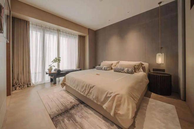 次卧背景墙采用米色和灰色硬包布料组合,搭配弧形墙面处理,品质感满满。