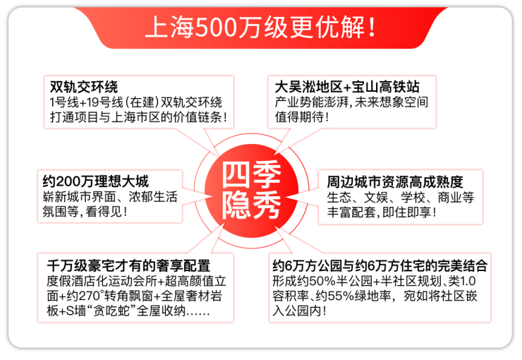 毫不夸张的说,四季隐秀站位大吴淞规划+双轨交通勤市区,以500万级的总价 对标上千万豪宅的产品力,在全市500万级新房中都是独一档的!