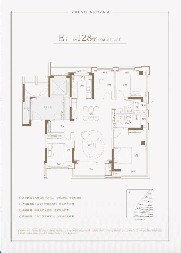 主力户型建面约128㎡4房2厅2卫,做到了3开间朝南+主卧套房设计+270°转角飘窗+多个飘窗+卫生间干湿分离,空间更加阔绰!