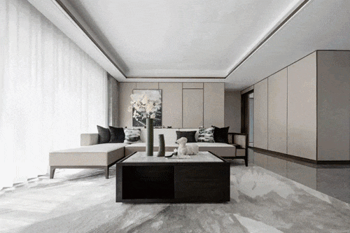 走进客厅之中,仿佛步入一幅山水画作之中一般.组合式的大理石岩板背景墙,以屏风式的形制,赋予了空间一派悠然自得的气韵.