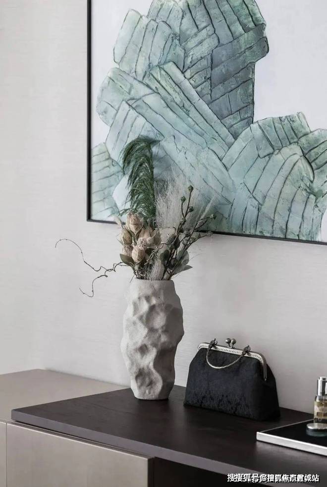 素雅的山石花瓶,还有嶙峋的中式挂画,以及香薰,都赋予了主卧满满的情调感.
