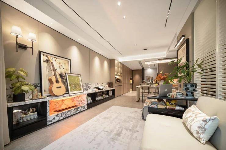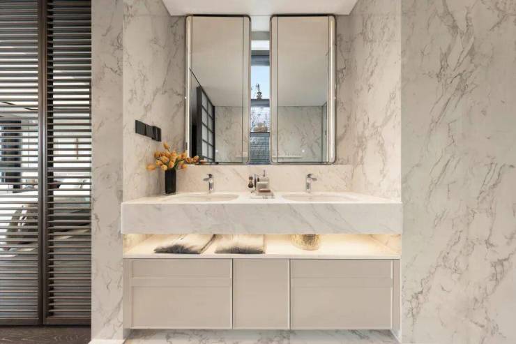 此外,室内还大量运用雅士白大理石、大花白岩板、皇家孔雀岩板、水纹夹丝玻璃、仿洞石岩板、卡拉卡塔白岩板、灰色皮革等定制材质,以华润置地独有的“五奢体系”,彰显着对高品质生活的极致追求。