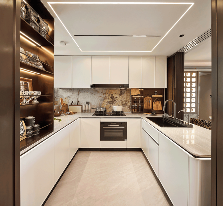 譬如说部分柜体更安全的圆角处理、高柜顶部一窥到底的镜面反光膜、大大提高空间利用的薄抽,不用弯腰一踢即开的踢脚抽设计,便利性大大增加;每一个细节都充分考虑到了未来居住的舒适性,这种产品颗粒度真的令人惊艳!