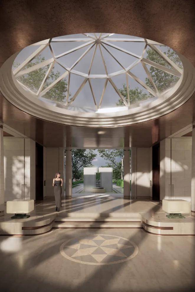 晴空穹顶:约7米直径的穹顶,其核心价值在于创造了一个 共享的、具有凝聚感的社区艺术客厅。无论是归家动线还是社区活动,它都是一个提升归属感的地标。
