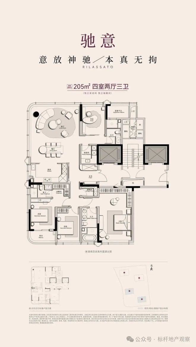 项目规划4幢12-17层小高层,主打205㎡(层高3.15米)、245㎡(层高3.3米)、300-380㎡顶跃(首层3.6米)三大奢阔户型。