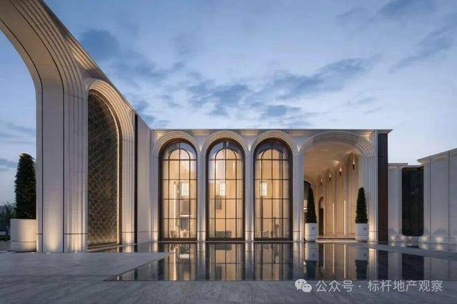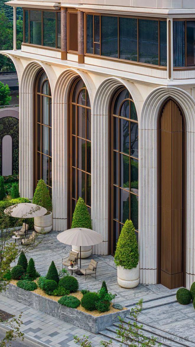 以意大利台地庄园为范,取意杭州郭庄之韵,通过披檐叠级、拱形重构、奢石符号等手法创造性结合,在现代设计框架下,打造出一方经典的艺术大宅。26个近十二米通高的拱券阵列于舒展的沿街界面中,宏大的尺度赋予庄重之感。斯卡帕式的叠退立面,于光影间演绎优雅美学,让回家成为一场风景漫步。