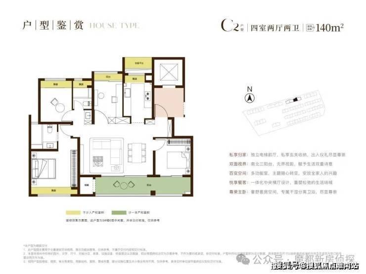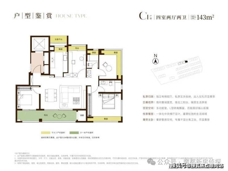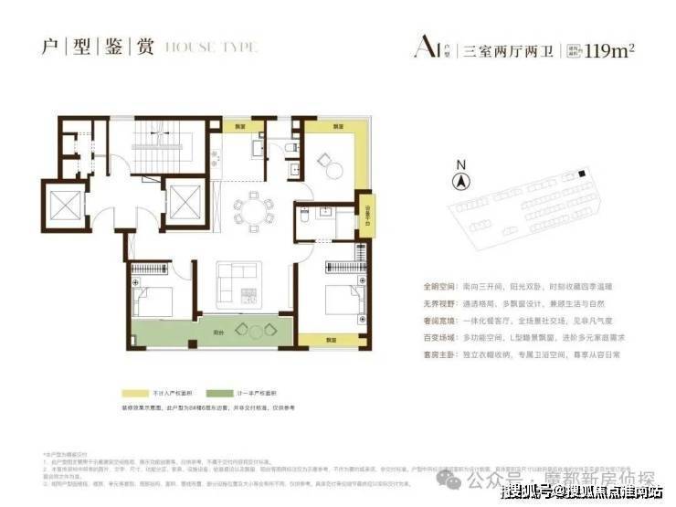户型结构:主力户型(面积、居室数量)、布局设计(南北通透 / 动静分区)、得房率、赠送面积、飘窗 / 阳台配置