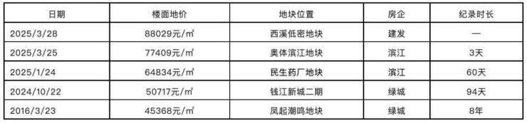 ◆杭州楼面地价纪录一览(2016-2025年)