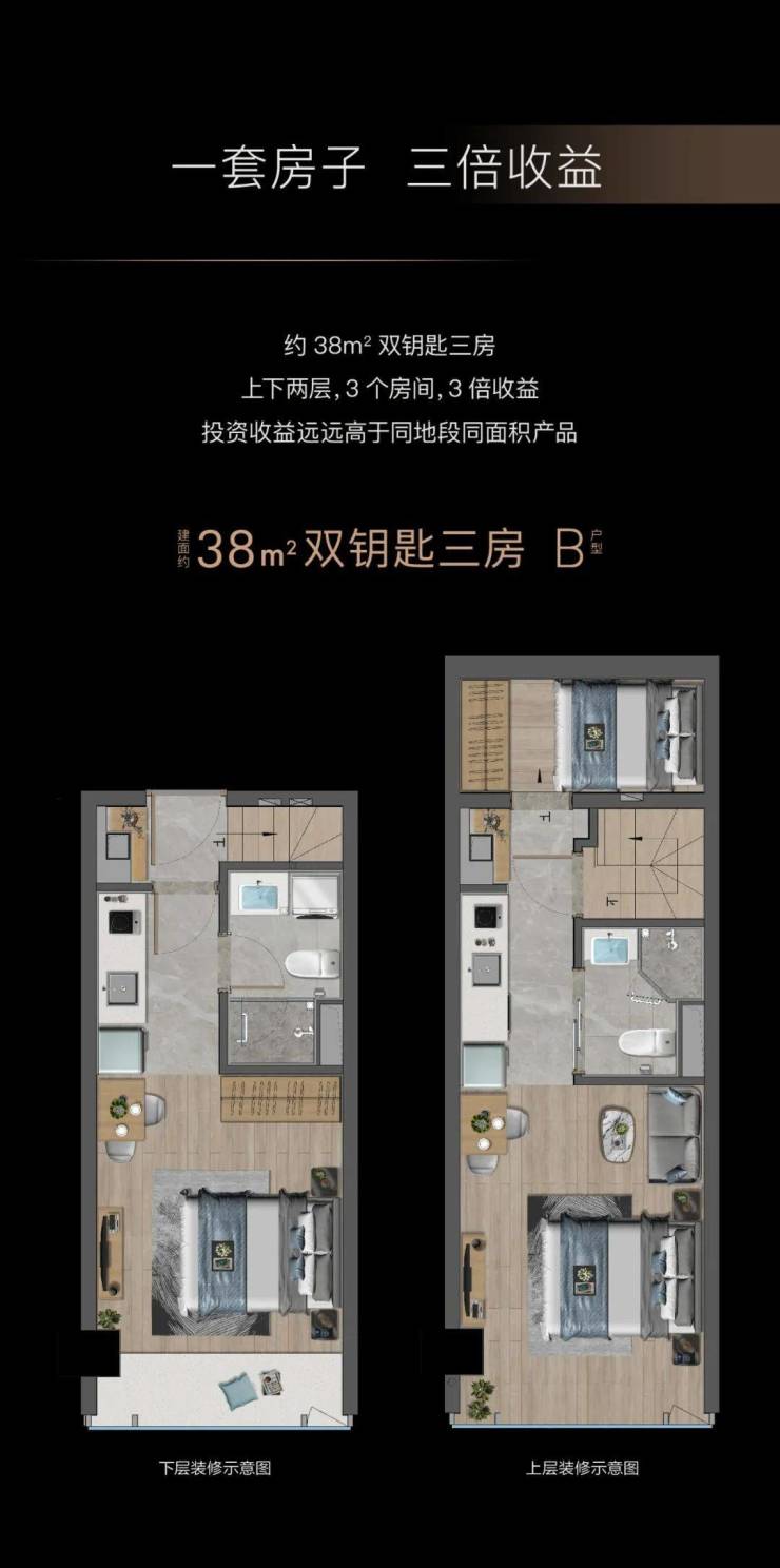 而约38-76㎡的产品构造上的应用,更将独特的几何审美诠释得淋漓尽致。在房产开发新政下,按最小单元分割的产品空间,可以更低总价实现买一层,送一层。周边高端产业、大型企业汇聚,也奠定了高租售市场的前景需求。