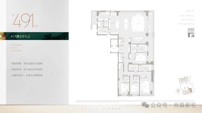 491.28㎡户型(11层):总价约8779万,单价178700元/㎡。梁志天大师亲自操刀室内设计,270度落地窗搭配约17米超级大阳台,最大化延伸采光面与瞰景视野。餐厨社交化、客厅多功能化、主卧小家化、次卧兴趣化的场景化设计,将艺术格调融入生活日常;地面局部点缀皇家蓝玻利维亚蓝奢石,卫生间铺陈静雅粽奢石,细节处雕琢高阶品位。