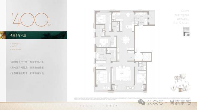 399.76㎡户型(6层):总价约6308万,单价157800元/㎡。空间尺度升级,厨房与家政间、客厅无缝衔接,操作动线流畅;保姆间双开门设计,出入便捷不打扰主人生活;南面客房卫生间均实现干湿分离,细节处彰显居住品质,适合多代同堂或注重生活质感的家庭。399.76 square meters户型 (6 floors): The total price is approximately 63.08 million yuan, with a unit price of 157,800 yuan per square meter. The space scale has been upgraded. The kitchen and the service room, as well as the living room, are seamlessly connected, ensuring a smooth operation path. The nanny room features double doors for easy access without disturbing the owner's life. The bathrooms in the south-facing guest rooms are all separated for dry and wet areas, highlighting the quality of living in details. This layout is suitable for multi-generational families or those who value a high-quality lifestyle.