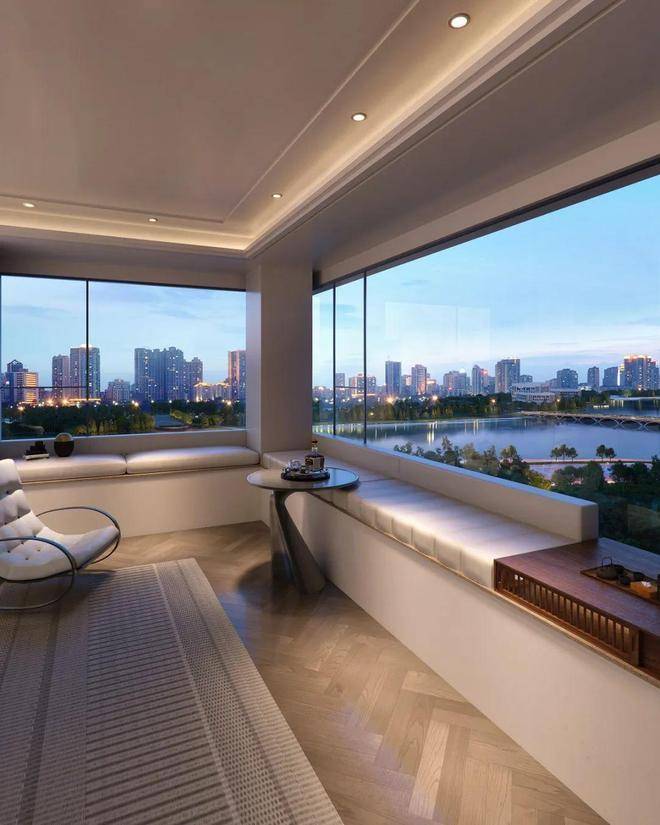 大面玻璃幕墙设计,超高的窗墙比,颜值极高,视觉上的延伸感像是给生活打开了全面屏相机,将自然景观尽收眼底。