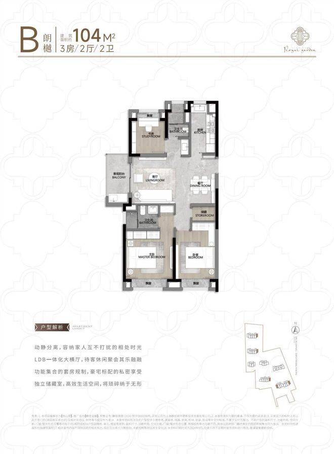 104㎡3户型特点:该户型多为楼栋的东边套,是一个观景户型。客厅连接270°阳台,视野出众。双卧朝南,阳光满溢。从次卫布局看,如果家庭人口较少,该户型还能做成双套卧。