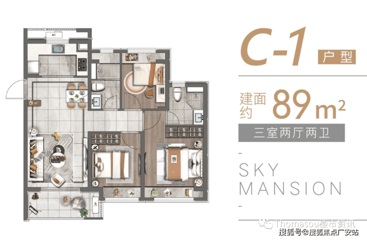 The construction area is approximately 89 square meters (three bedrooms, two living rooms and two bathrooms)