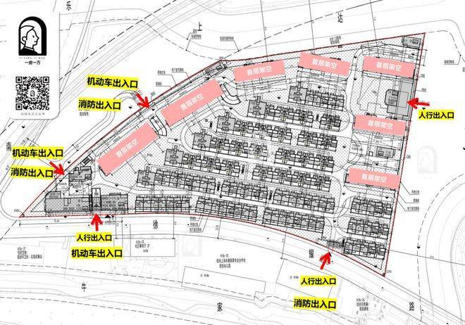 车行出入口主要设置在乐强南路和徐耀路,人行主要出入口设置在规划绿地和徐耀路,实现人车的完全分离。