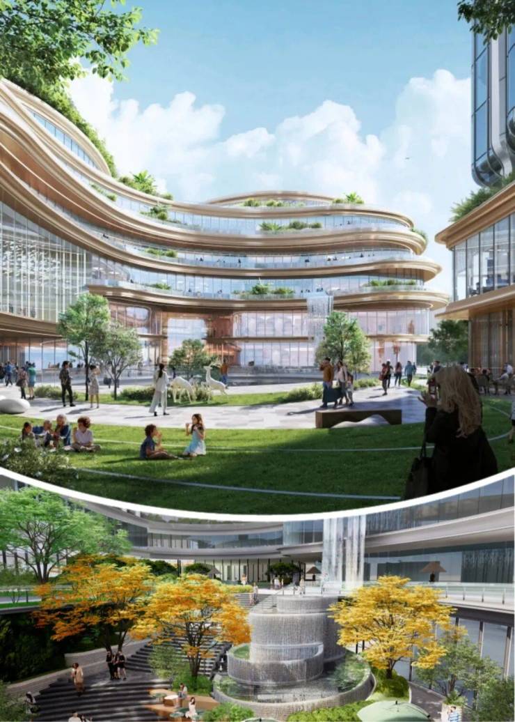 云门公园(直线距离约350米),总面积约30万方,相当于42个足球场,它把江南园林的丘、峰、台、阁都搬了进来,还规划了“公园十景”,未来感十足。最大的特色是有一条巨大的空中绿廊,把西站、办公楼都连了起来。里面还会建青少年活动中心(城西分中心)、文化活动中心、健身中心,户外儿童活动场地还有大片草坪和水系。