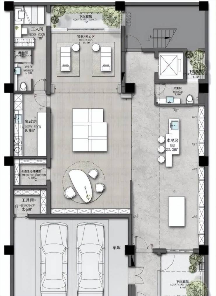 ·地下室6米挑高客厅+下沉式花园采光天井