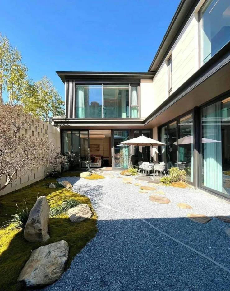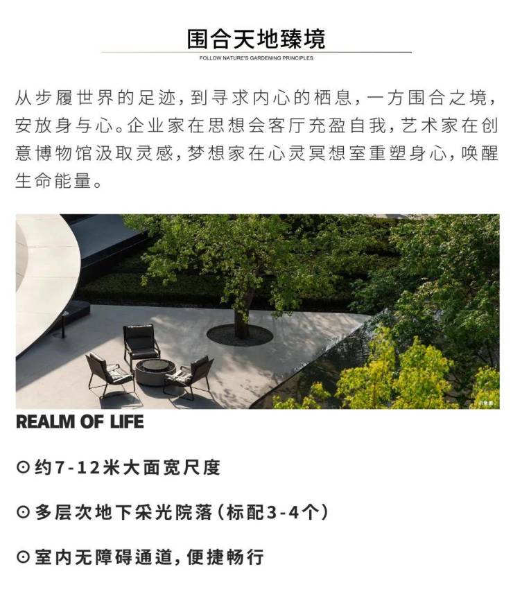 设计师以三面建筑和一面围墙,四合成内聚型的景观空间,庭院居于其中,成为建筑各房间的视线焦点。每户均有80至100平方米的开放式内庭院,宅在院中,宅院合一,天地共生,天人合一。每户地下层面均有3处花园式采光天井,保证了地下空间的舒适通透。