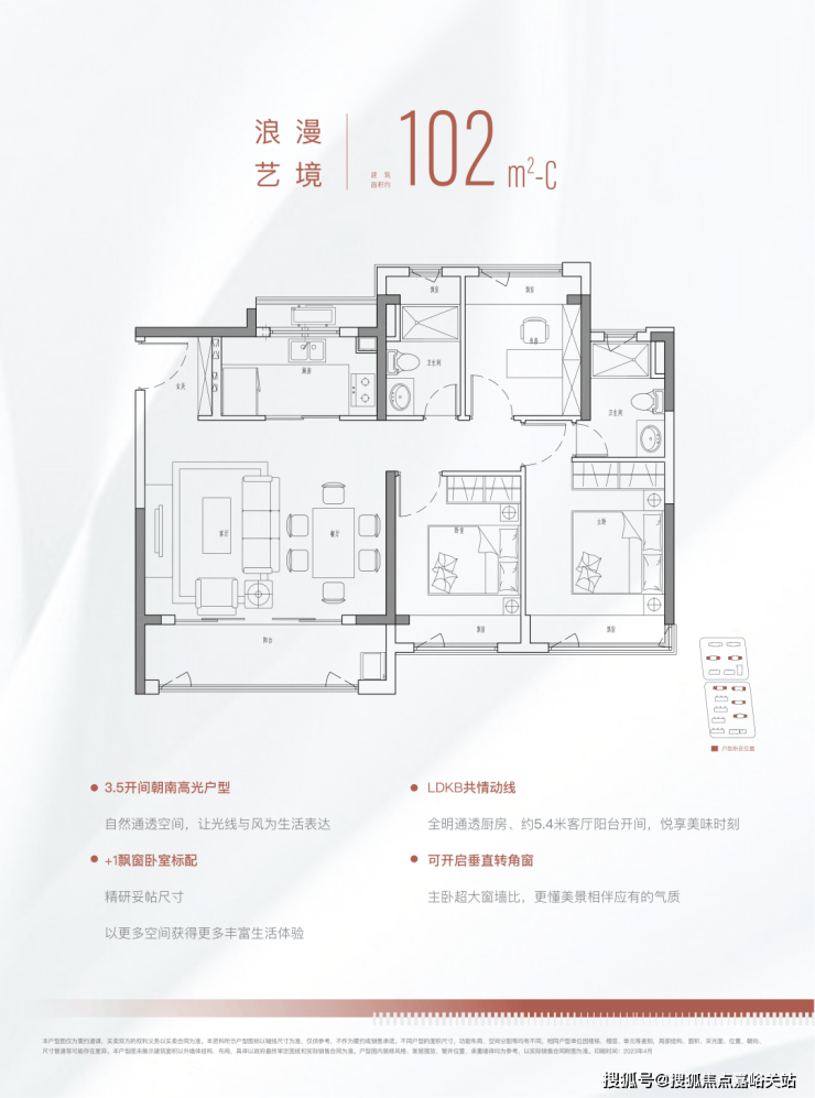 这个户型相信年轻人更喜欢,毕竟,哪个年轻人会拒绝270度采光的客厅呢!这套户型同样拥有约80%的高得房率、灵活机动空间等优点,而且布局上隐私性更强、窗墙比更高!主卧和次卧是完全隔断的,从归家动线上来看,主次卧的轨交动线几乎不重叠.这种设计很适合两代同住的家庭,因为很多年轻人因为下班晚,是不希望打扰到长辈的.南向窗墙比达到约41%-45%,空间通透感十足!租住过上海老公房的朋友很多都对高窗墙比有一定执念,这个户型相信打动了不少人的心!102m²的户型也很难让人不爱: