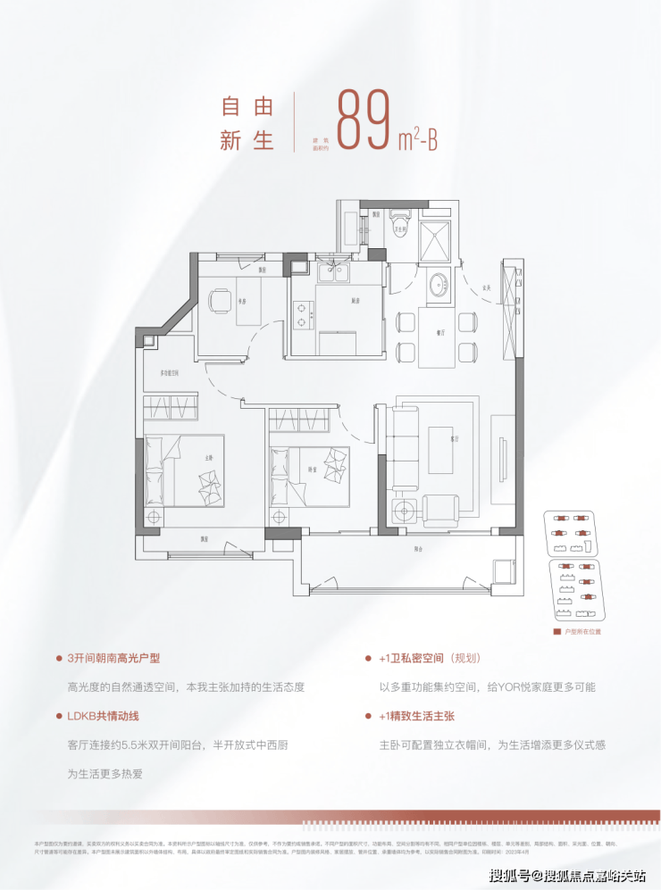 不同于一般的三房把这个小房间直接做了主卫,这个项目把选择权留给了购房者,并在下方铺设了上下水管、相当人性化!除了以上亮点之外,这个户型还有惊喜小细节.为了解决爱买买买的年轻人收纳痛点,户型设计上保留了厨房最大的收纳空间,可以打双组吊柜.在主卧和次卧都预留了收纳柜的位置.除了三开间朝南的经典户型,89m²还做了三面通风的户型.
