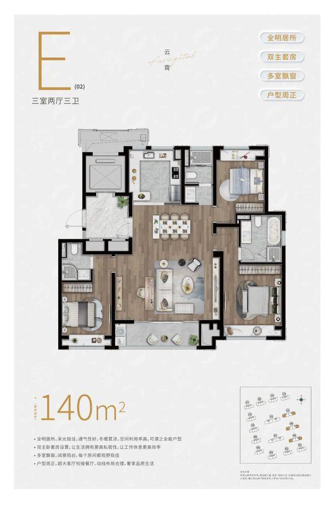 140㎡三房两卫:南北通透,客厅朝南,开放厨房设计,总价约896万起4