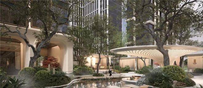 入口约99米超尺度宏阔气象,取海派艺术大师吴湖帆《晓云碧嶂》中云岫初开的晨曦图,通过渐变晕染的山水长卷演绎青峰山林的诗意场景。奢石、名树点染其中,勾勒尊崇归家序幕。