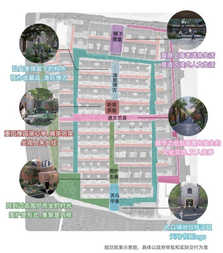 雅集六境:入园俯拾,开启百年天马华章;下沉庭院偶遇交谈,围炉生春;临水而憩,犹如豫园湖心亭听泉茶叙;随心漫步,清赏博古原址老构件;中庭樾下雅集,怀旧洋房的生活趣味;东西主轴的通文艺荟,植入文化故事,围上“人文”腰封。