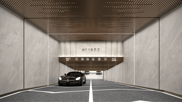入口对行人、机动车进行优化分流,保障业主安全;而地面停车位,方便参观者、业主等临时停车的需求。另外在车库上,项目还打破了常规地库的单调、晦暗。直接将豪车专属的星空顶搬入了地库里。从车行驶入地库的那一刻开始,一场名为“宏大”的归家之旅就开始了。通道入口,顶部优雅的星空放射灯,展现出浩瀚星空般的深邃、璀璨,搭配两侧的高级铺面材质,尽显奢华气质。