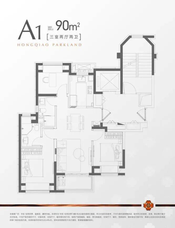 建面约90m²三房两厅两卫,刚需上车不二之选!同样是飞机户型,南北通透,全明户型,空间利用率高!而且,必须强调的是:同面积段市面上其他新房大多只做到1卫,而华发虹桥四季做到了2卫,大大提升了整体的功能性!