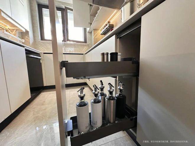 采用顶天立地高柜设计,嵌入电器的同时,通过透明密封罐统一收纳干货杂粮并贴标存放于拉篮内,容量充足可叠放约8个山姆款家庭装零食大礼包;并将备餐区下方的抽屉升级,配置碗碟拉篮、分区调味拉篮,实现 “一拉到位、一目了然”,可满足6-8人份碗筷收纳需求,吊柜搭配升降拉篮解决高处取物难题。