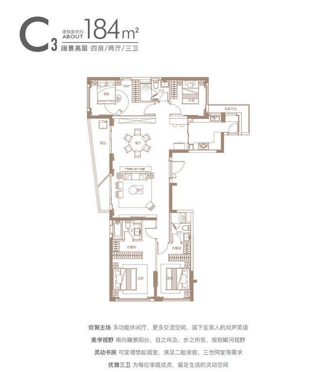 餐客厅阳台一线贯通,动线流畅,弧形阳台拓展景观视野。