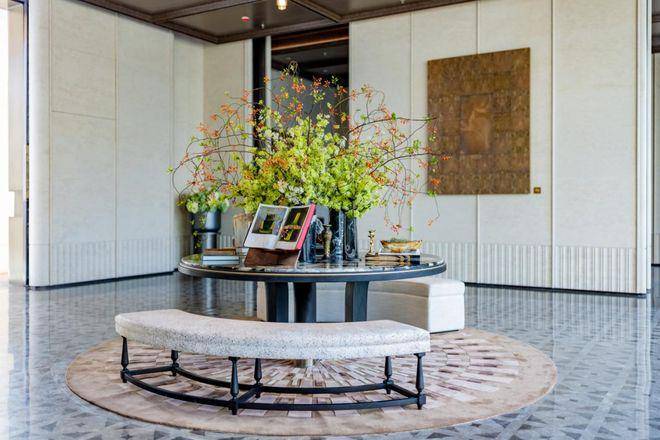 项目首层通过硬朗直线呼应柔和曲线勾勒,辅以温润石材与古铜色金属线条融合,打造东西方美学共融的艺术藏品。