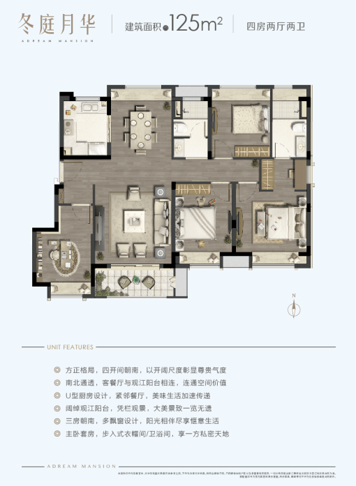 建面约125平方米的四房,在尺度感与功能性上进一步升级,客餐厅+阳台,阳光通透无碍;并且空间开阔,让孩童玩耍、老人休闲、友人聚会的空间更加阔绰。室内功能上,四开间朝南,主卧套房设计,尺度感十足,私密感优质。
